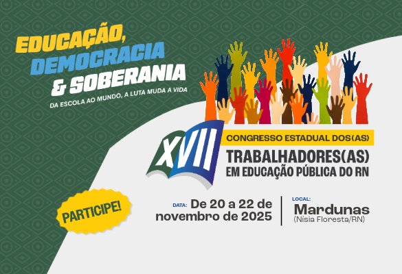 Salário, carreira, condições de trabalho, conjuntura e outros temas de interesse de professores e funcionários da educação vão pautar o XVII Congresso Estadual dos Trabalhadores em Educação Pública do Rio Grande do Norte. O evento será realizado nos dias 20, 21 e 22 de novembro, no Mardunas Hotel e Eventos, em Nísia Floresta, com o tema: “Educação, democracia e soberania: da escola ao mundo, a luta muda a vida”.